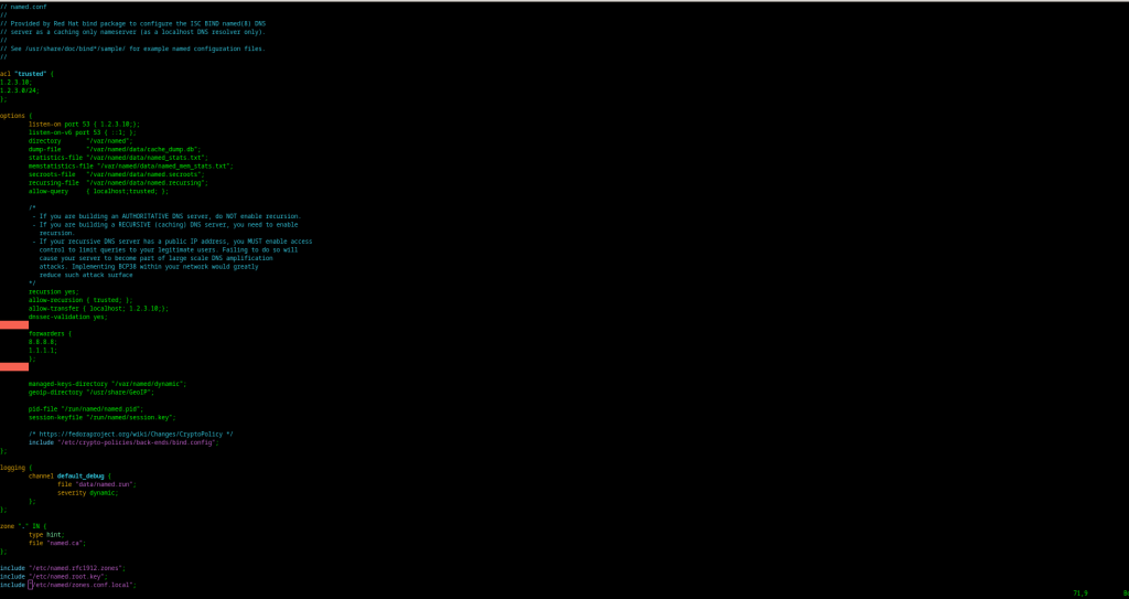 vim etc/named.conf a giriyoruz ve aşaıdaki örnekteki gibi konfigrasyon dosyamızı düzenliyoruz.