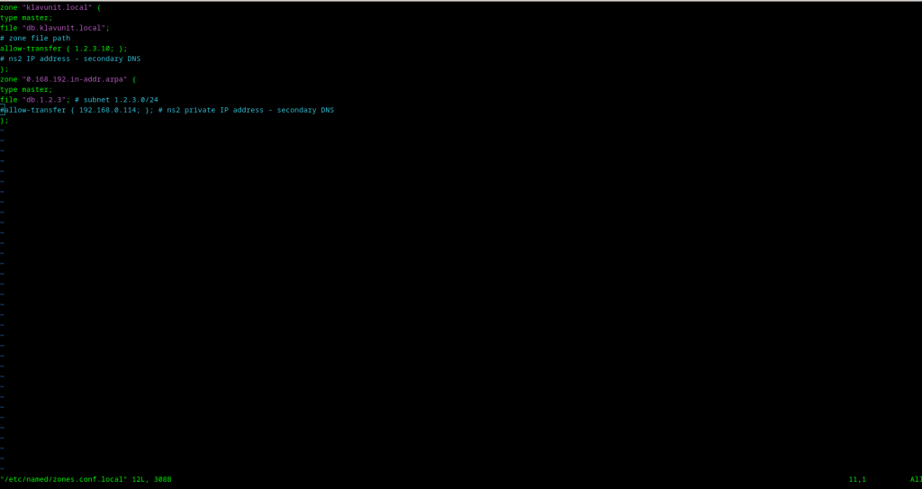 Ardından vim /etc/named/zones.conf.local ile zone.conf.local dosyamıza giriş yapıyoruz buradaki ayarları aşağıdaki gibi düzenleyebiliriz