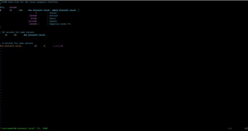 Şimdi Forward lookup zone konfigrasonu’nu yapıyoruz. vim /var/named/db.klavunit.local