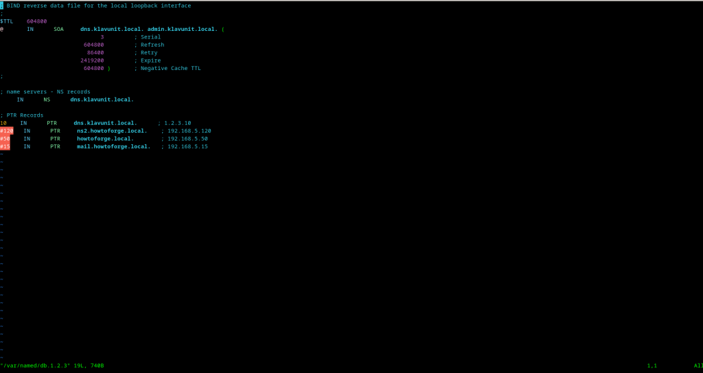 Sırada Reverse lookup zone konfigrasyonu’nu yapıyoruz. vim /var/named/db.1.2.3