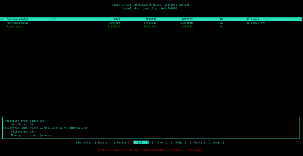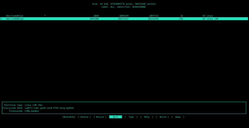 cfdisk /dev/sdx > burda diski oluşturuyoruz ve Linux_LVM I seçiyoruz.