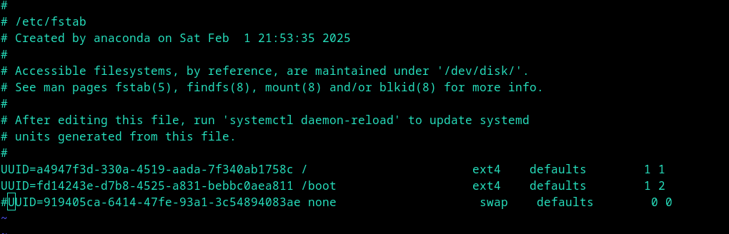 vi /etc/fstab komutu ile swap partitionu yeni swap partition UUID ‘si ile değiştiritiyoruz ve ardından swapon -a komutu ile swap alanımızı aktif ediyoruz